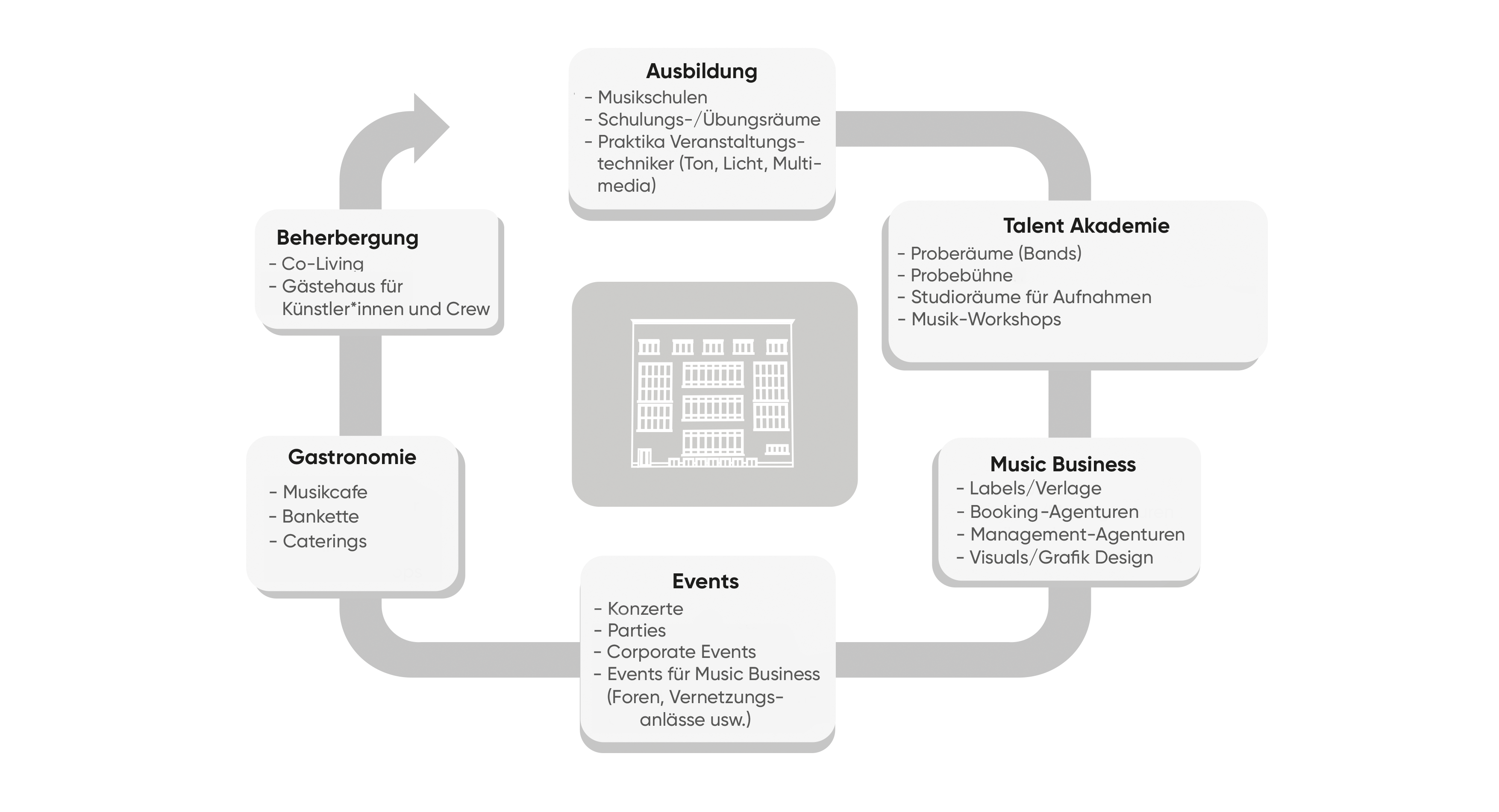A curated ecosystem will be created that touches on every step of a musician's career; from training and education to talent development, networking with the business and performance opportunities on various stages. In addition, spacious and partly freely accessible meeting zones will be created for networking and as inspiration for like-minded people; an X-TRA Limmathaus of music for musicians, creatives, the music business and for cultural city and neighborhood life.